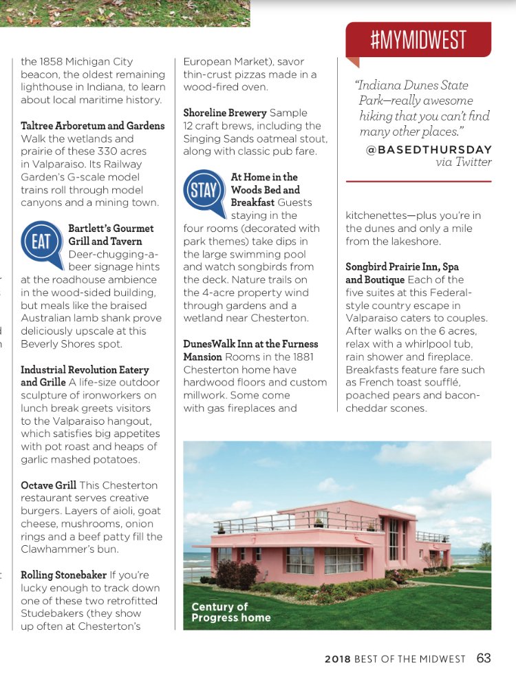 Songbird Prairie Inn is featured in Midwest Living in the section “Out and About Chicago”. The Indiana Dunes National Park is just an hour from the Loop; And so is Songbird Prairie Bed and Breakfast! We are a Lake Michigan Inn and Spa, which features a federal style home with five Luxurious suites so suites book up quickly! Especially for holidays and festivals. Enjoy “Breakfast with the Birds”