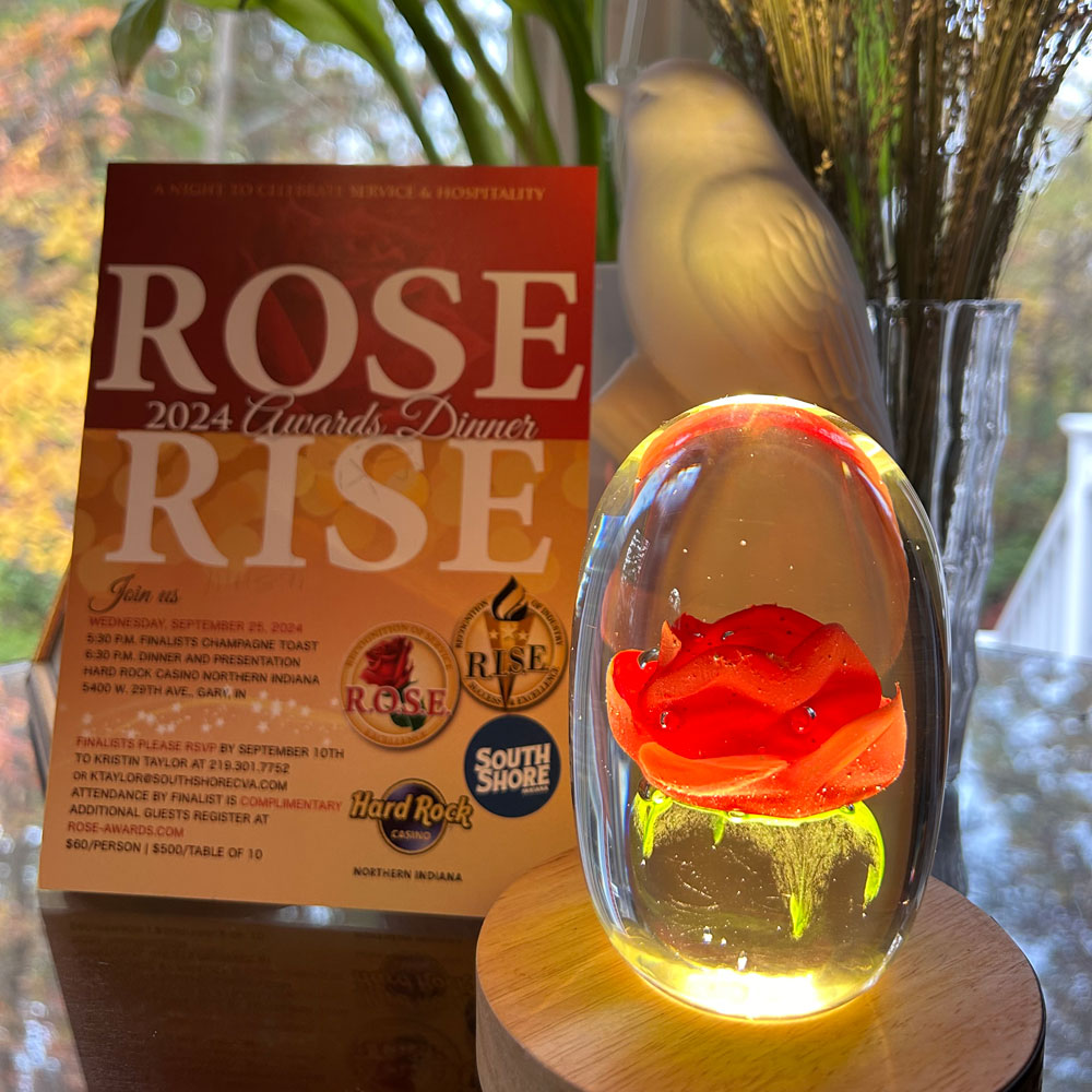 The R.I.S.E. Award is for managerial employees who have risen above expectations when directly interacting with customers on a regular basis and is Recognition of Industry Success and Excellence. The beautiful rose award was given by Lake County Tourism for Recognition of Industry Success and Excellence (R.I.S.E.)